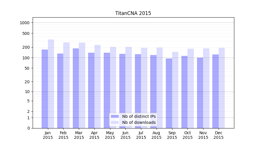 Number of downloads for software package TitanCNA, year by year, from 2025 back to 2014 (years with no downloads are omitted):