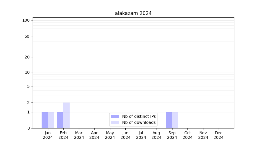 Number of downloads for software package alakazam, year by year, from 2025 back to 2014 (years with no downloads are omitted):