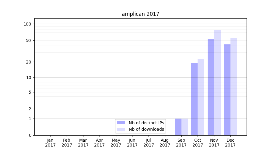 Number of downloads for software package amplican, year by year, from 2025 back to 2014 (years with no downloads are omitted):
