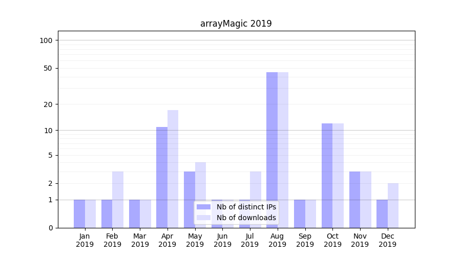 arrayMagic_2019_stats.tab| Month | Nb of distinct IPs | Nb of downloads |