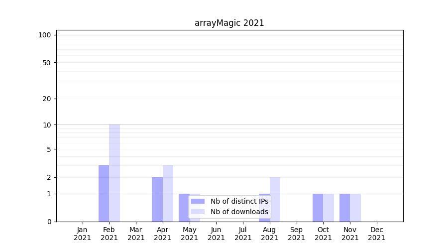 arrayMagic_2021_stats.tab| Month | Nb of distinct IPs | Nb of downloads |
