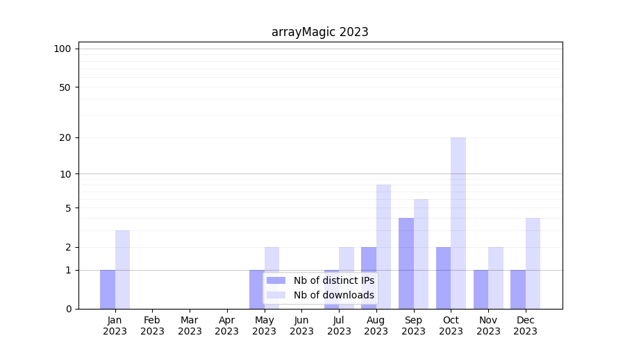 arrayMagic_2023_stats.tab| Month | Nb of distinct IPs | Nb of downloads |