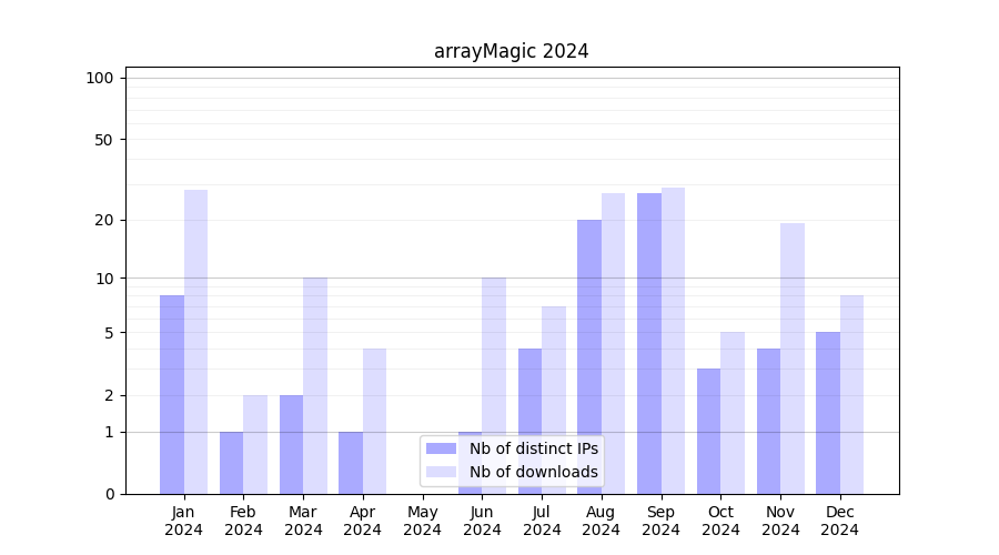 arrayMagic_2024_stats.tab| Month | Nb of distinct IPs | Nb of downloads |