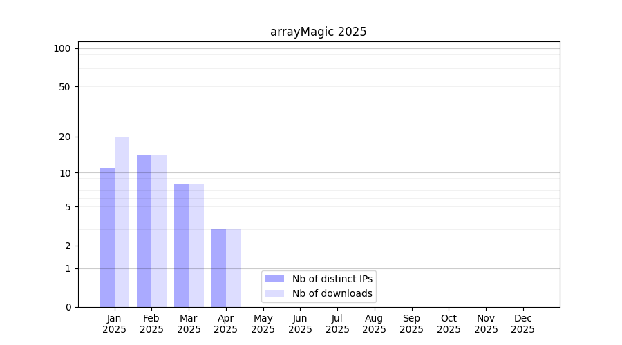 arrayMagic_2025_stats.tab| Month | Nb of distinct IPs | Nb of downloads |