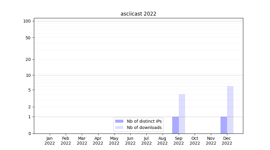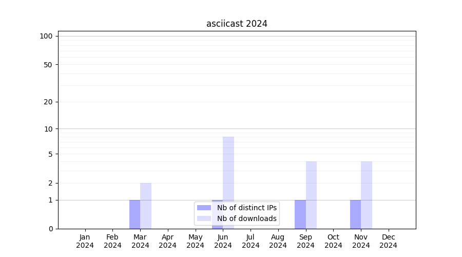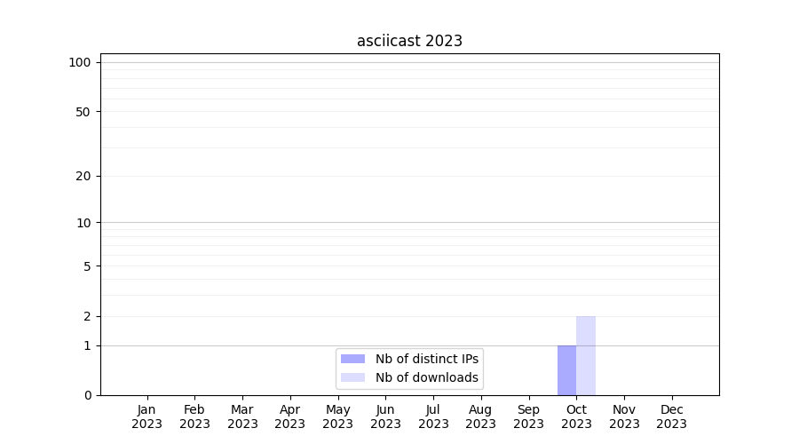 Number of downloads for software package asciicast, year by year, from 2025 back to 2014 (years with no downloads are omitted):