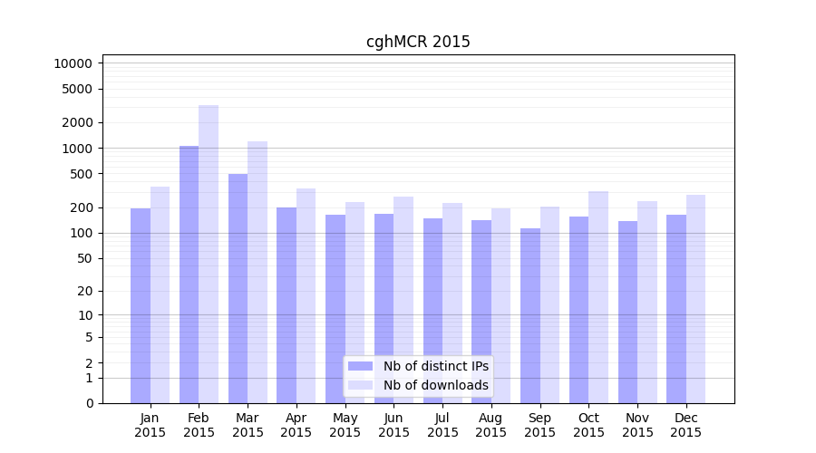 Number of downloads for software package cghMCR, year by year, from 2025 back to 2014 (years with no downloads are omitted):