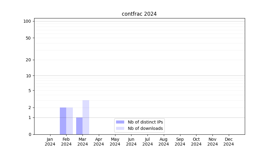 Number of downloads for software package contfrac, year by year, from 2025 back to 2014 (years with no downloads are omitted):