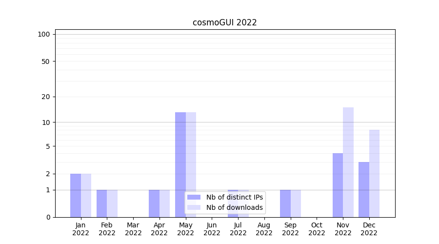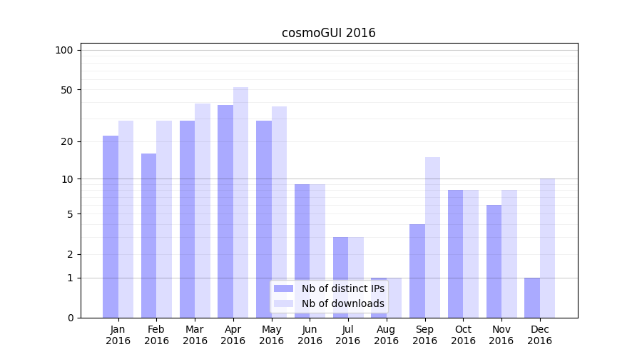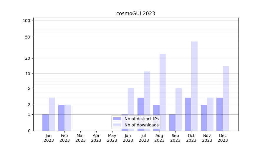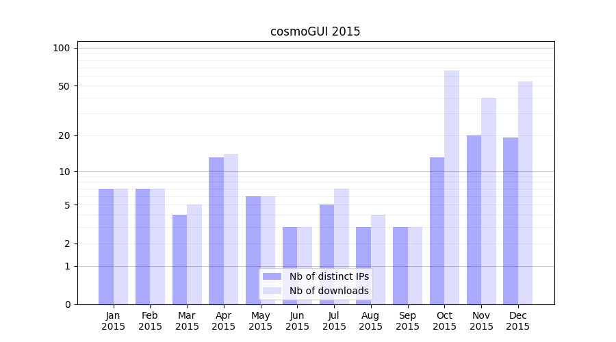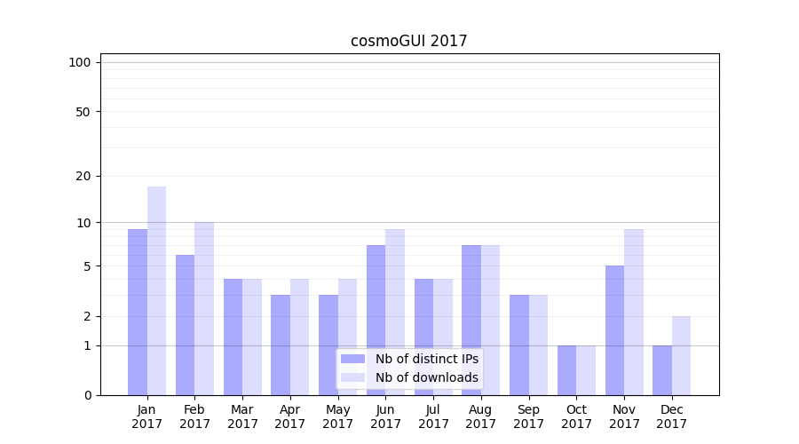 Number of downloads for software package cosmoGUI, year by year, from 2025 back to 2014 (years with no downloads are omitted):
