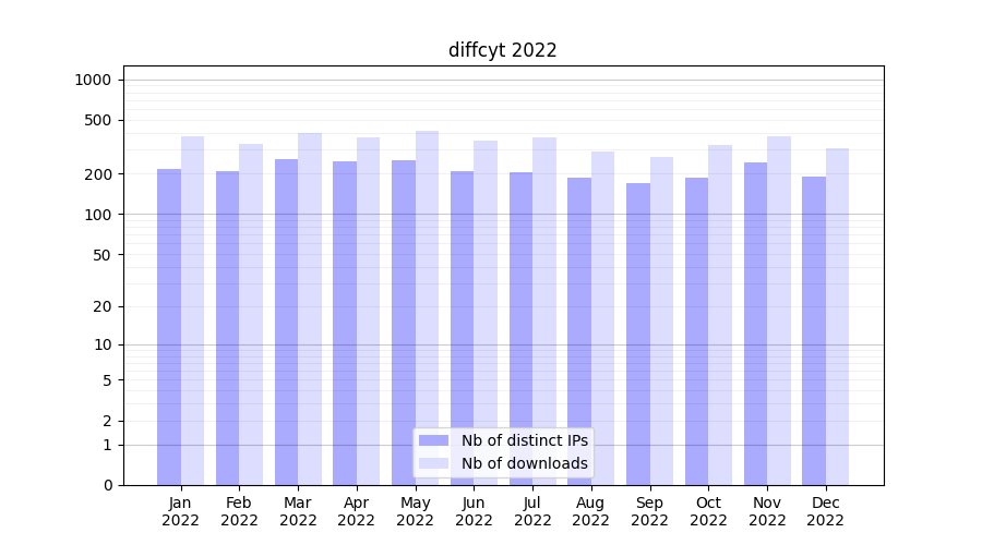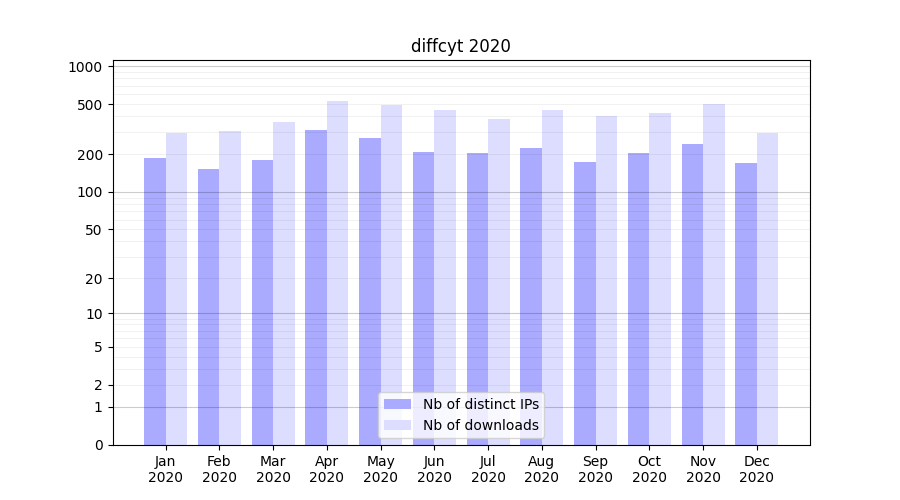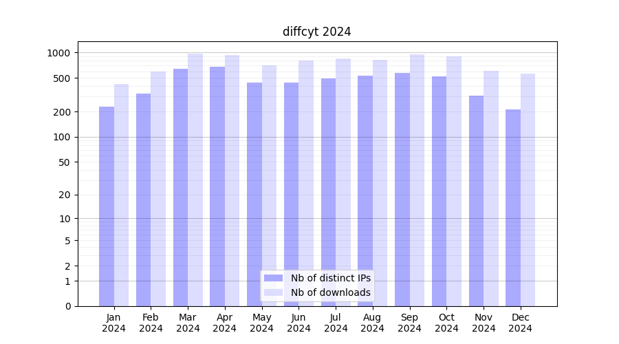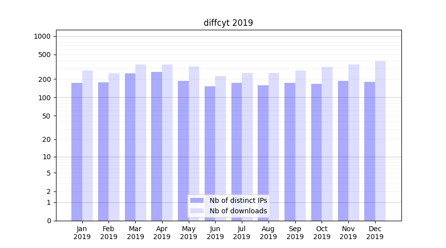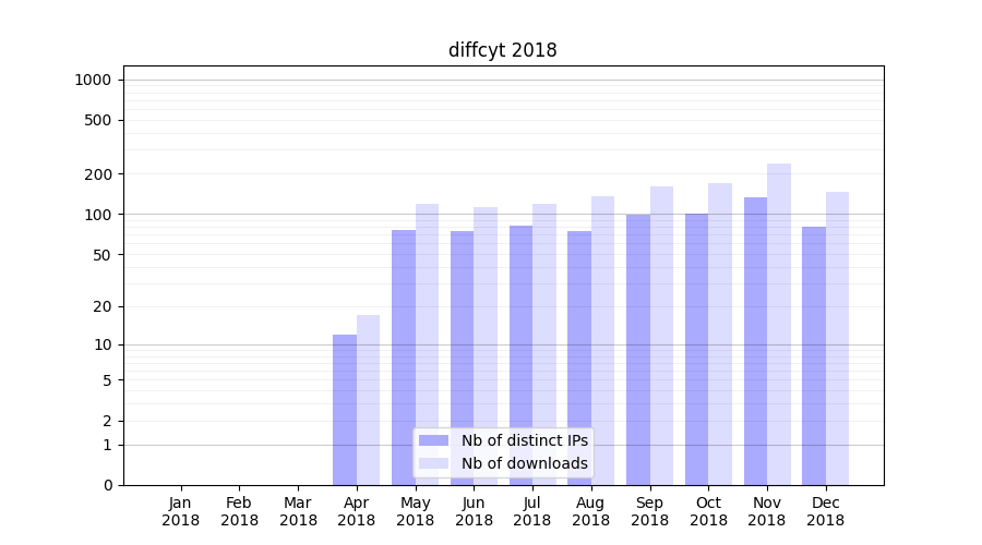 Number of downloads for software package diffcyt, year by year, from 2025 back to 2014 (years with no downloads are omitted):