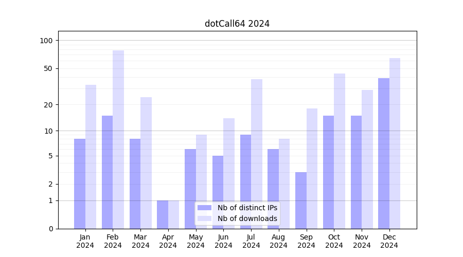 Number of downloads for software package dotCall64, year by year, from 2025 back to 2014 (years with no downloads are omitted):