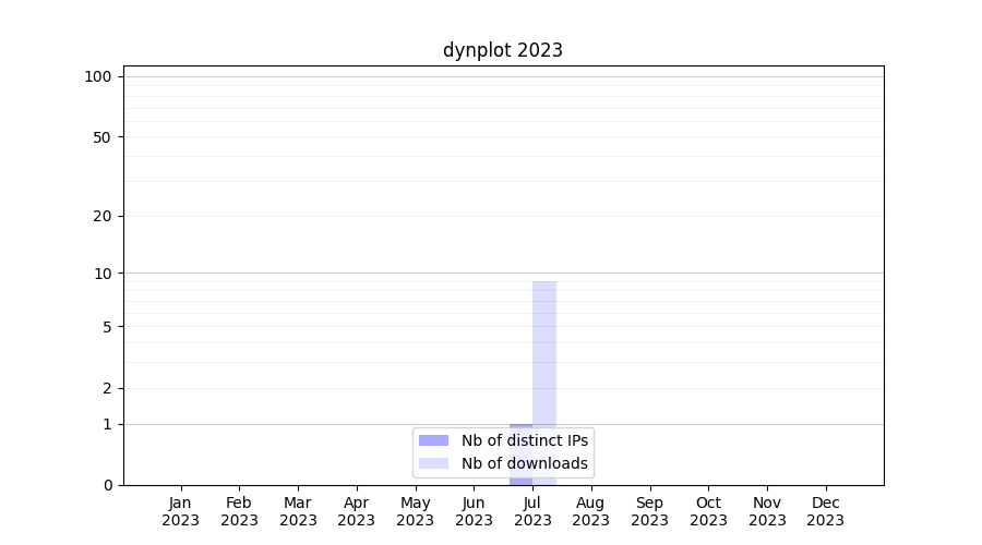 Number of downloads for software package dynplot, year by year, from 2025 back to 2014 (years with no downloads are omitted):