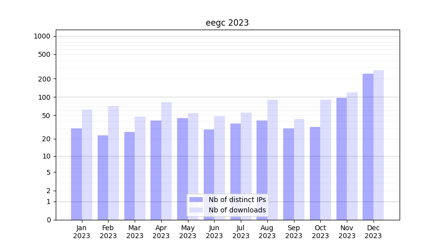 Number of downloads for software package eegc, year by year, from 2025 back to 2014 (years with no downloads are omitted):