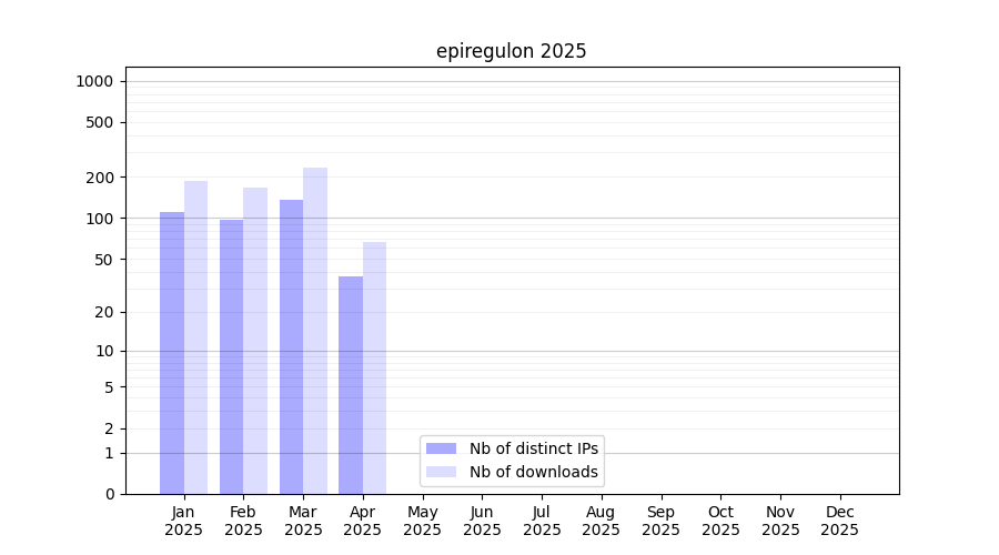 Number of downloads for software package epiregulon, year by year, from 2025 back to 2014 (years with no downloads are omitted):