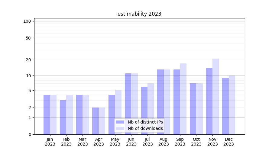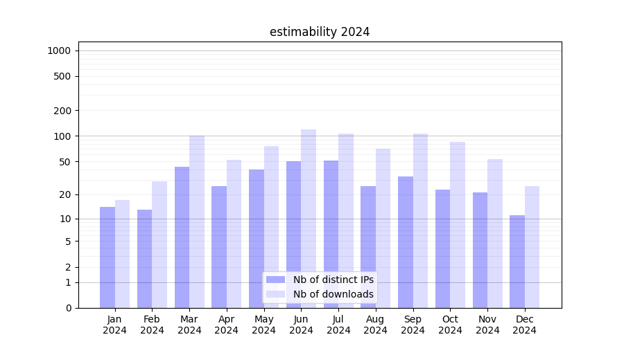 Number of downloads for software package estimability, year by year, from 2025 back to 2014 (years with no downloads are omitted):