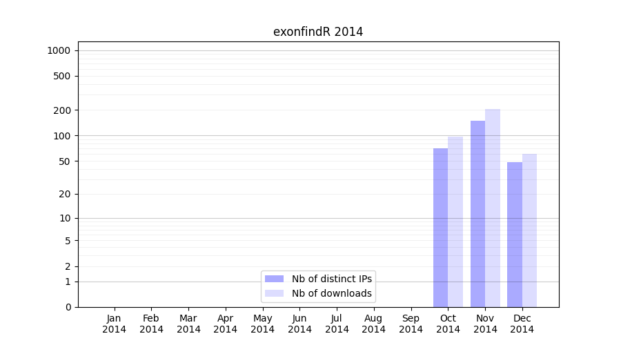 Number of downloads for software package exonfindR, year by year, from 2025 back to 2014 (years with no downloads are omitted):