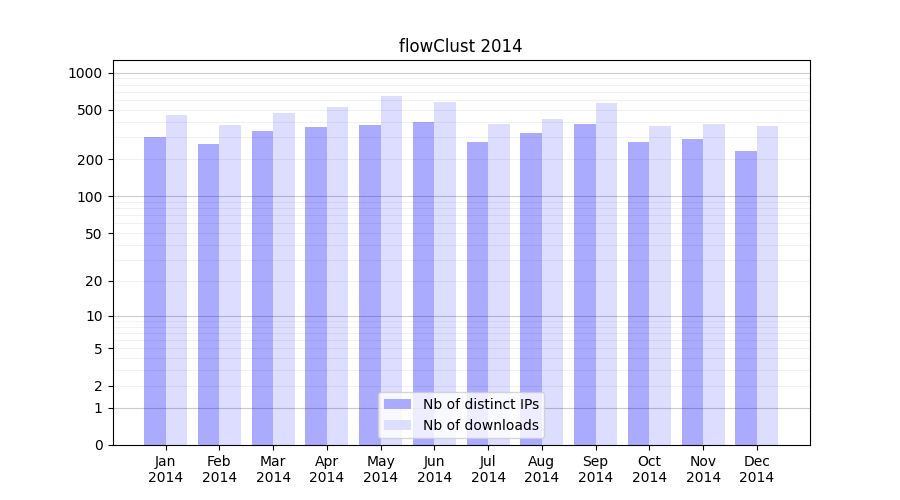 Number of downloads for software package flowClust, year by year, from 2025 back to 2014 (years with no downloads are omitted):