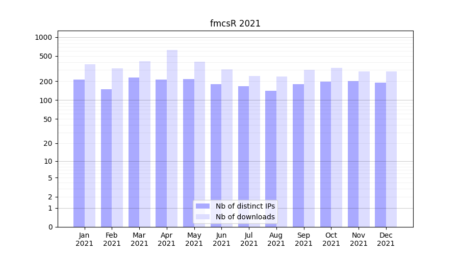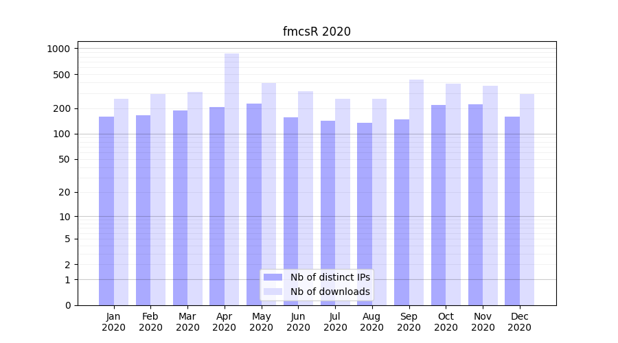 Number of downloads for software package fmcsR, year by year, from 2025 back to 2014 (years with no downloads are omitted):