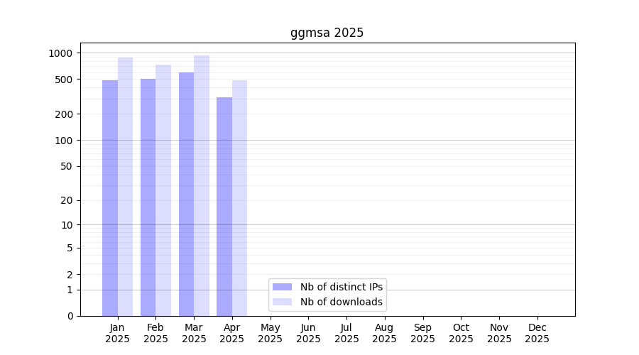 Number of downloads for software package ggmsa, year by year, from 2025 back to 2014 (years with no downloads are omitted):