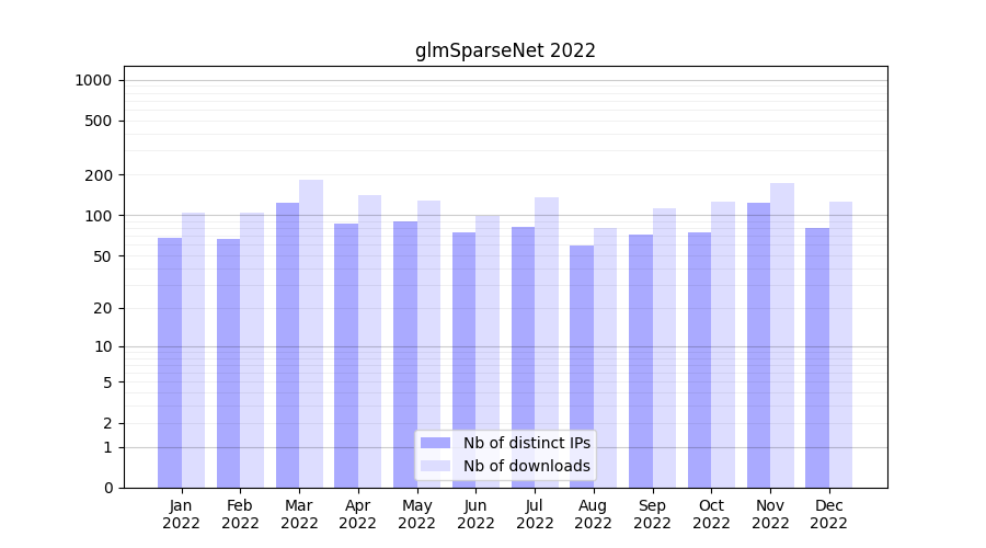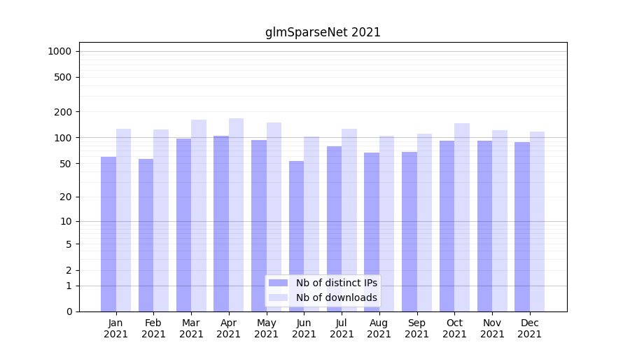 Number of downloads for software package glmSparseNet, year by year, from 2025 back to 2014 (years with no downloads are omitted):