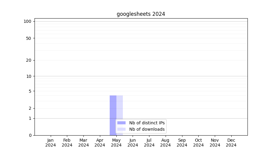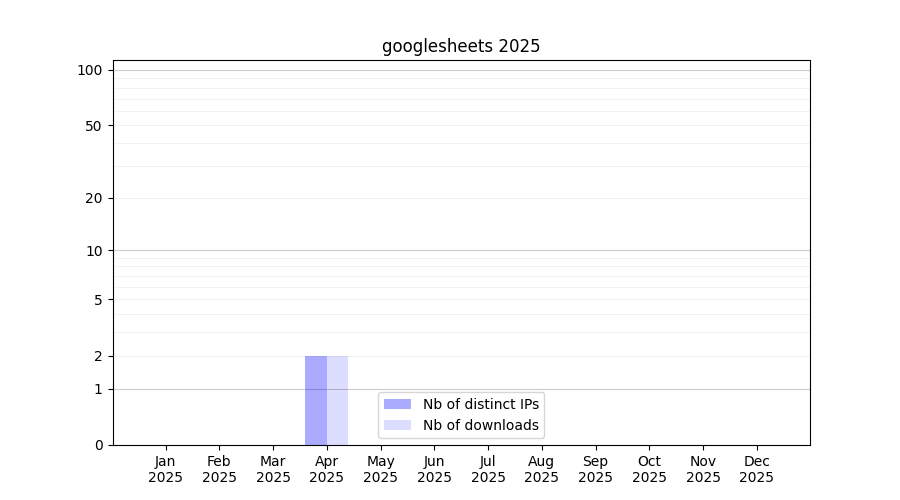 Number of downloads for software package googlesheets, year by year, from 2025 back to 2014 (years with no downloads are omitted):