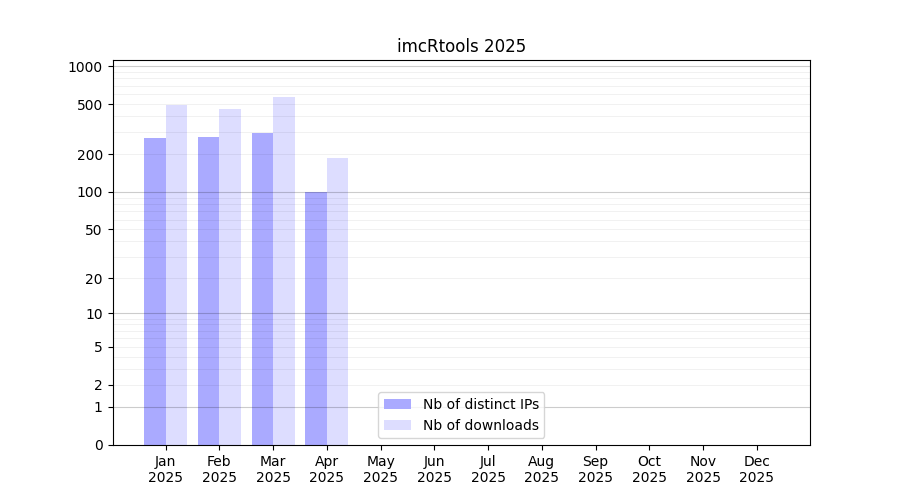 Number of downloads for software package imcRtools, year by year, from 2025 back to 2014 (years with no downloads are omitted):