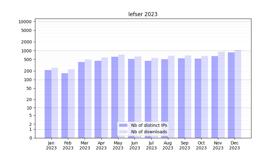 Number of downloads for software package lefser, year by year, from 2025 back to 2014 (years with no downloads are omitted):