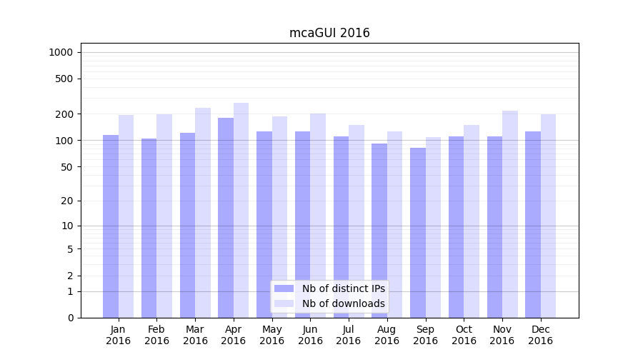 mcaGUI_2016_stats.tab| Month | Nb of distinct IPs | Nb of downloads |
