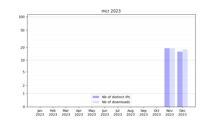 Number of downloads for software package mcr, year by year, from 2025 back to 2014 (years with no downloads are omitted):