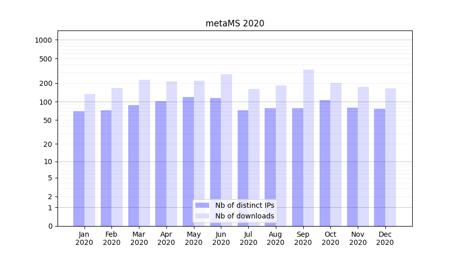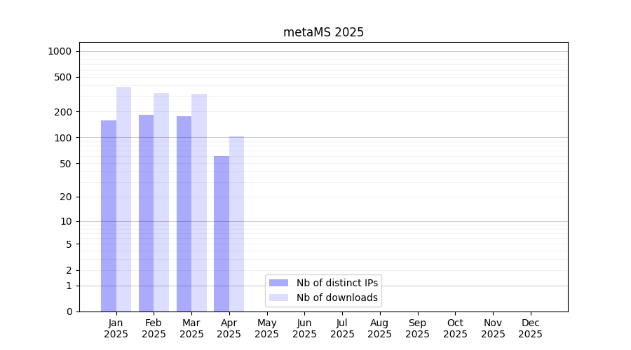 Number of downloads for software package metaMS, year by year, from 2025 back to 2014 (years with no downloads are omitted):