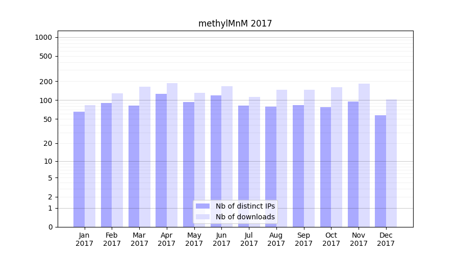 Number of downloads for software package methylMnM, year by year, from 2025 back to 2014 (years with no downloads are omitted):