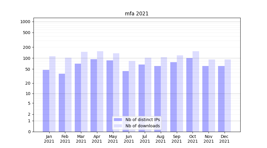 Number of downloads for software package mfa, year by year, from 2025 back to 2014 (years with no downloads are omitted):