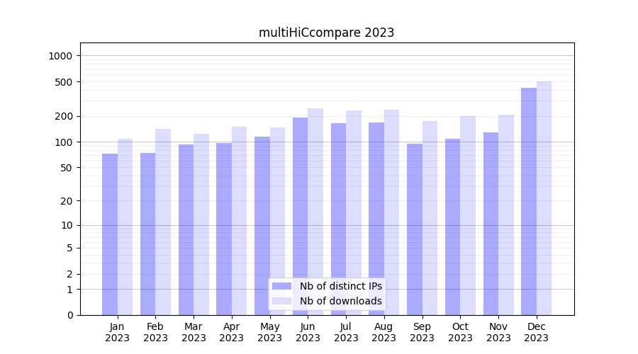 Number of downloads for software package multiHiCcompare, year by year, from 2025 back to 2014 (years with no downloads are omitted):