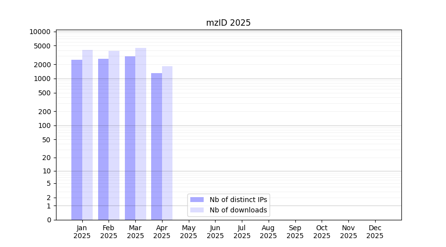 Number of downloads for software package mzID, year by year, from 2025 back to 2014 (years with no downloads are omitted):