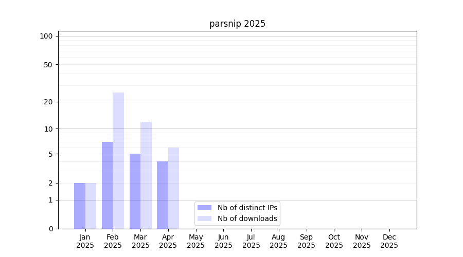 parsnip_2025_stats.tab| Month | Nb of distinct IPs | Nb of downloads |