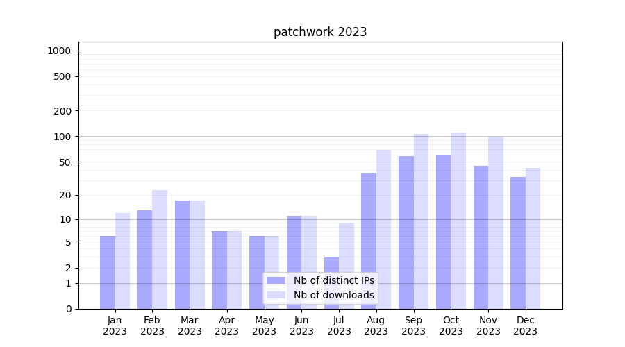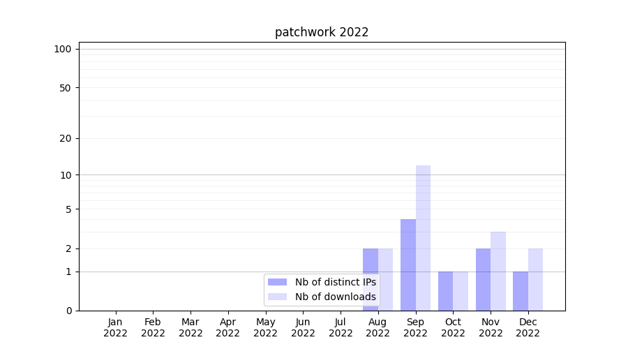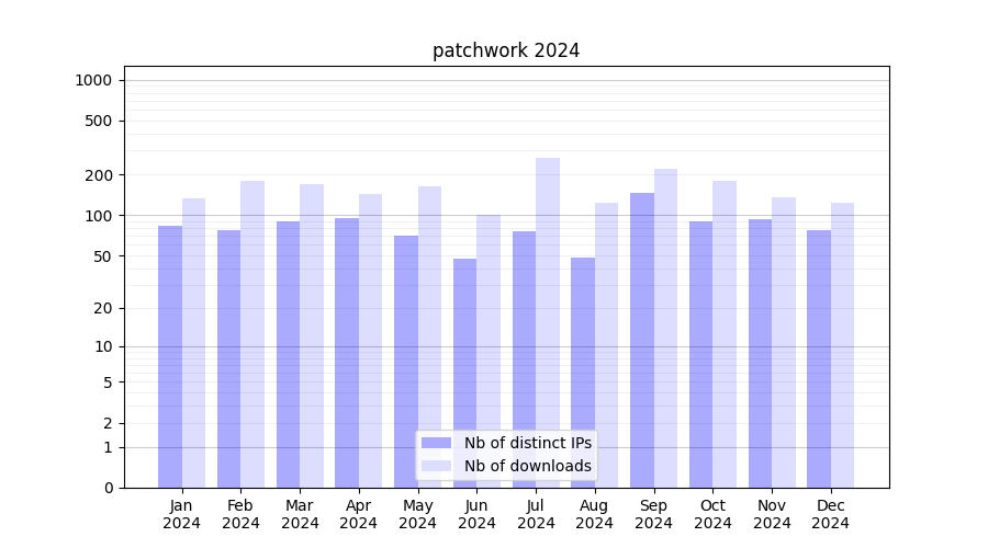 Number of downloads for software package patchwork, year by year, from 2025 back to 2014 (years with no downloads are omitted):