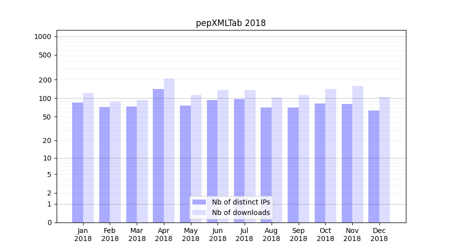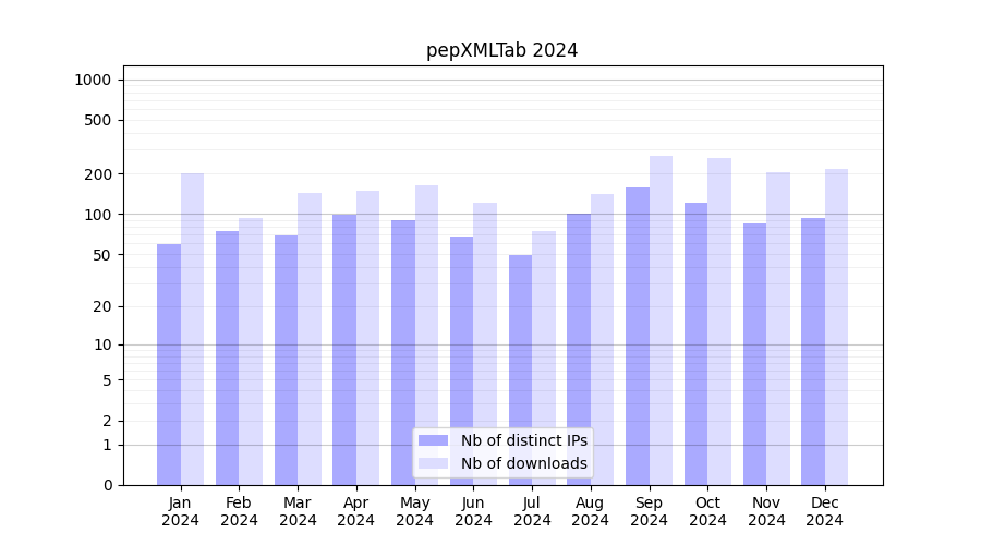 Number of downloads for software package pepXMLTab, year by year, from 2025 back to 2014 (years with no downloads are omitted):