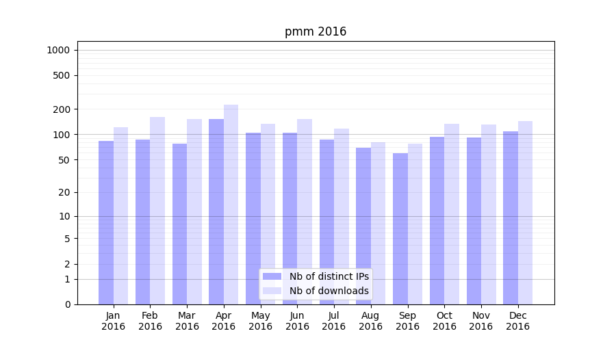 Number of downloads for software package pmm, year by year, from 2025 back to 2014 (years with no downloads are omitted):