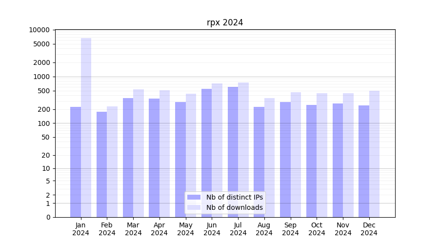 Number of downloads for software package rpx, year by year, from 2025 back to 2014 (years with no downloads are omitted):