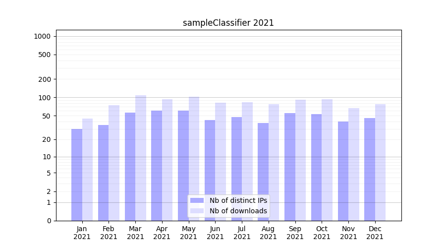 Number of downloads for software package sampleClassifier, year by year, from 2025 back to 2014 (years with no downloads are omitted):