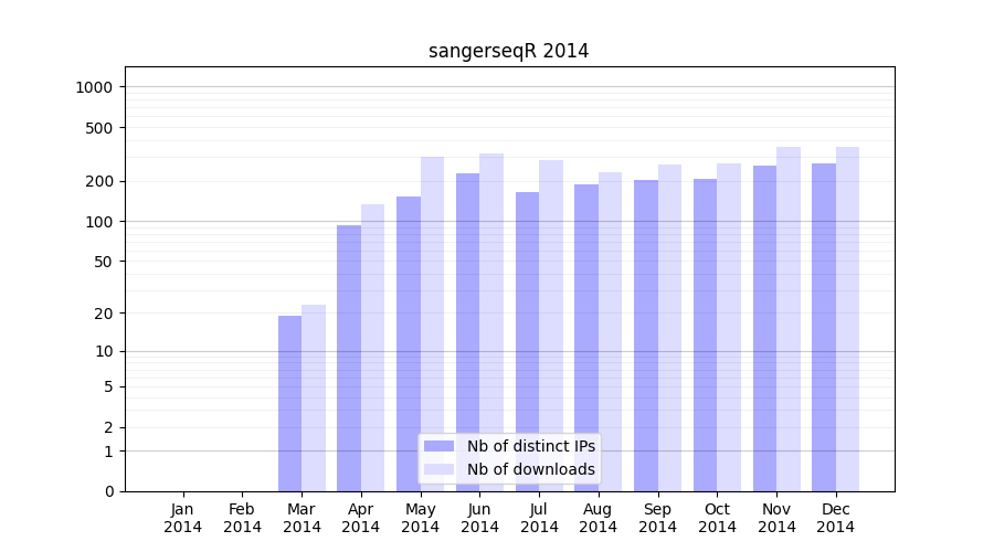 Number of downloads for software package sangerseqR, year by year, from 2025 back to 2014 (years with no downloads are omitted):
