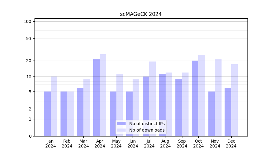 Number of downloads for software package scMAGeCK, year by year, from 2025 back to 2014 (years with no downloads are omitted):