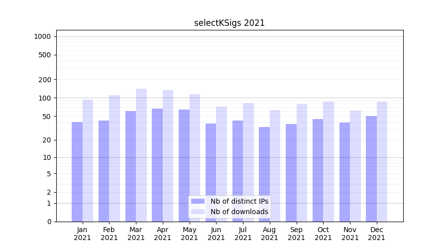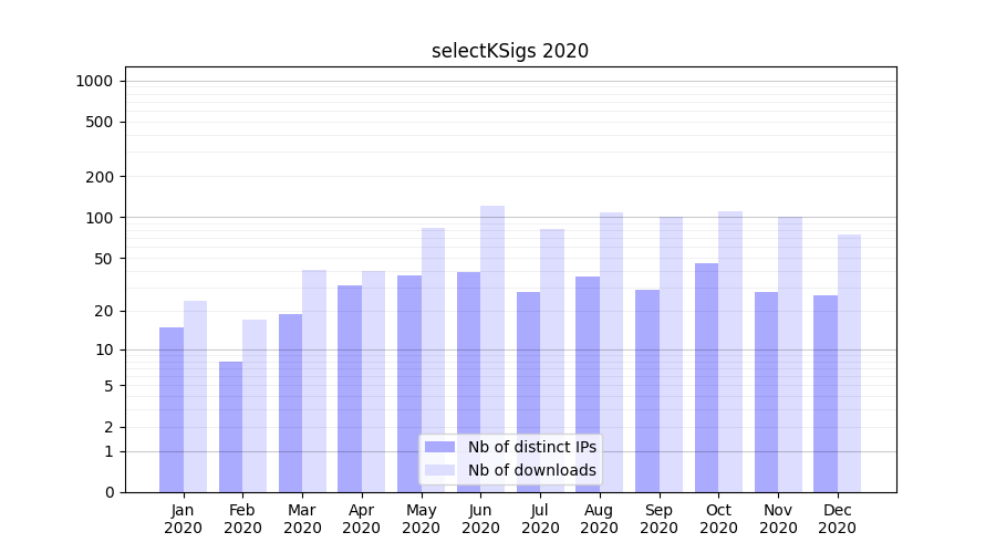 Number of downloads for software package selectKSigs, year by year, from 2025 back to 2014 (years with no downloads are omitted):