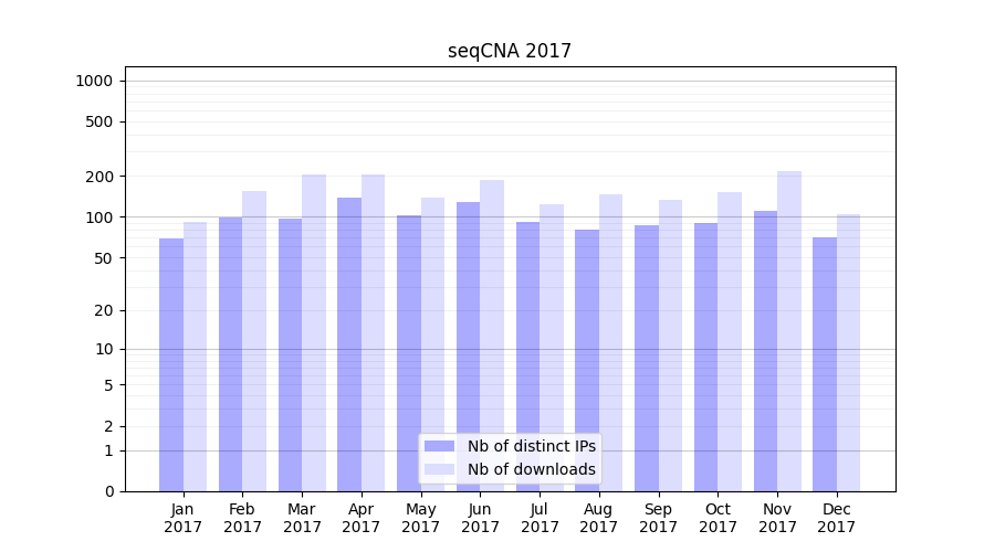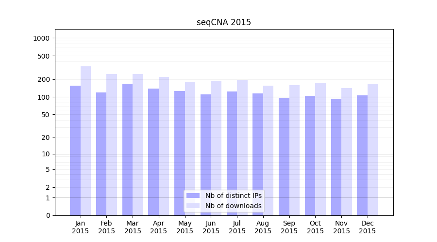 Number of downloads for software package seqCNA, year by year, from 2025 back to 2014 (years with no downloads are omitted):