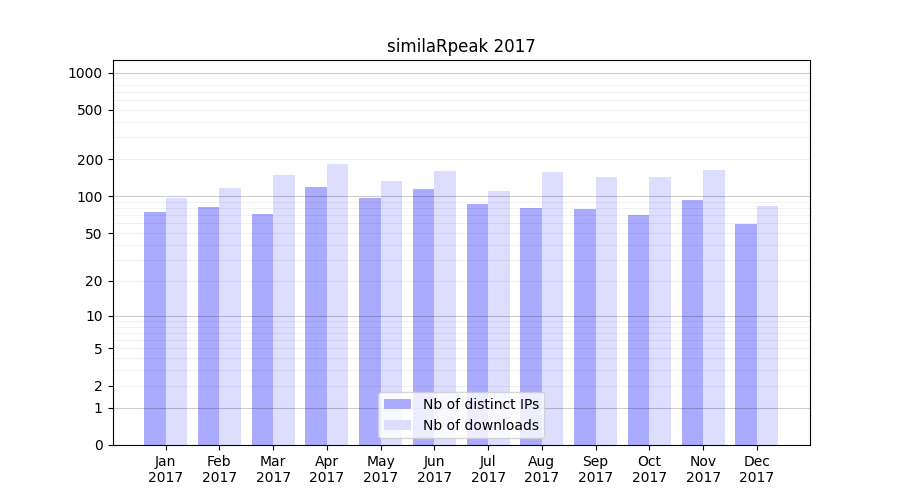 Number of downloads for software package similaRpeak, year by year, from 2025 back to 2014 (years with no downloads are omitted):