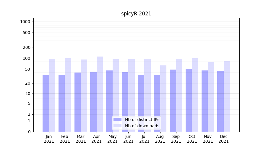 Number of downloads for software package spicyR, year by year, from 2025 back to 2014 (years with no downloads are omitted):