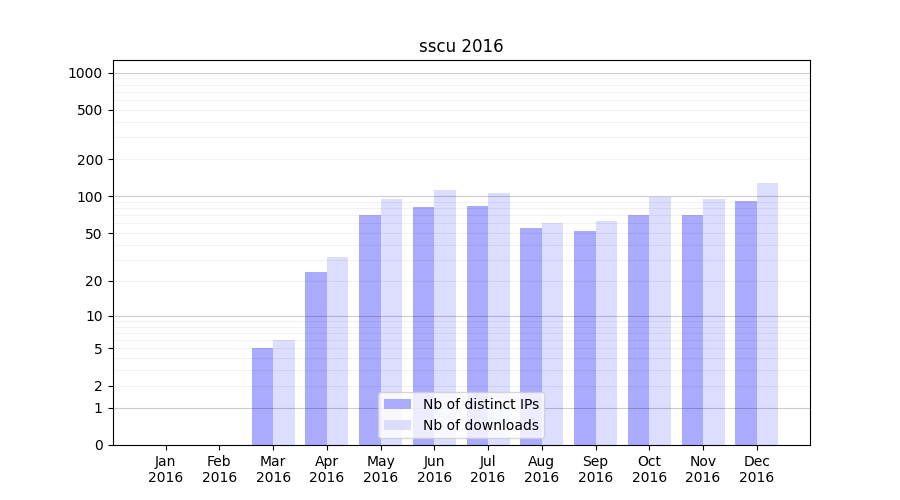 Number of downloads for software package sscu, year by year, from 2025 back to 2014 (years with no downloads are omitted):