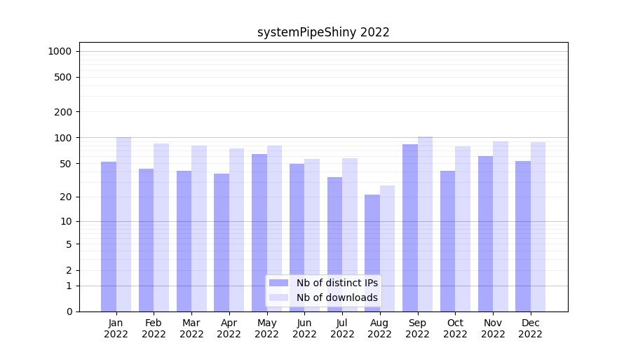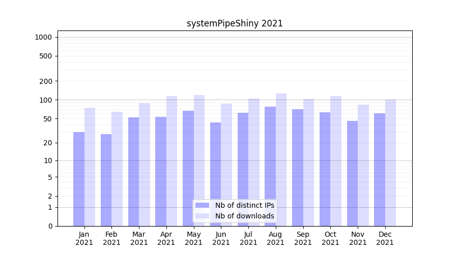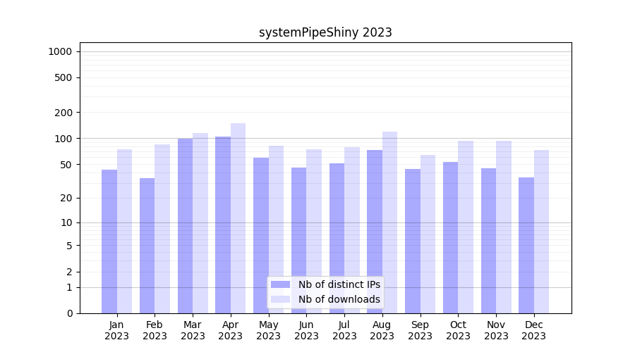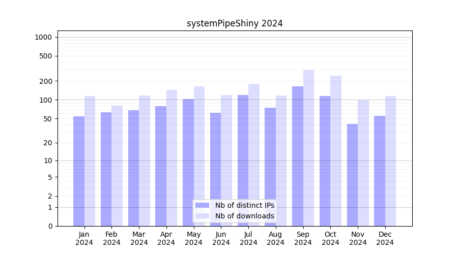 Number of downloads for software package systemPipeShiny, year by year, from 2025 back to 2014 (years with no downloads are omitted):