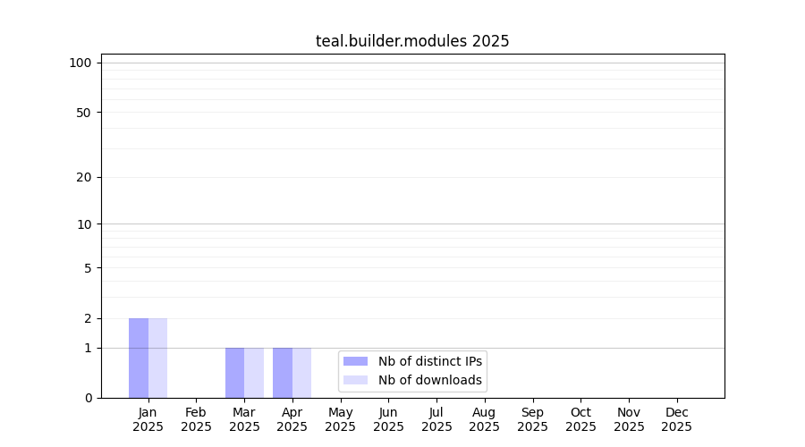 Number of downloads for software package teal.builder.modules, year by year, from 2025 back to 2014 (years with no downloads are omitted):