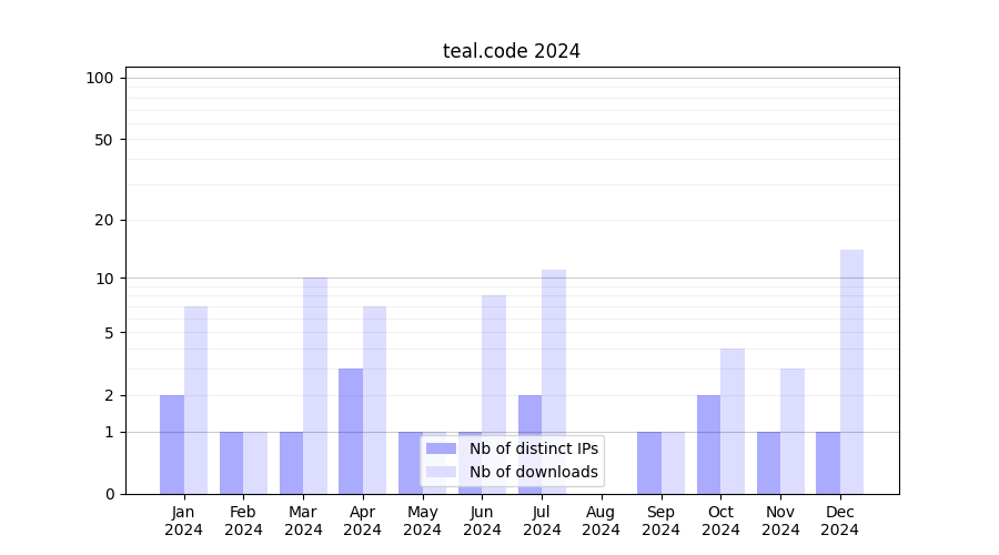 Number of downloads for software package teal.code, year by year, from 2025 back to 2014 (years with no downloads are omitted):