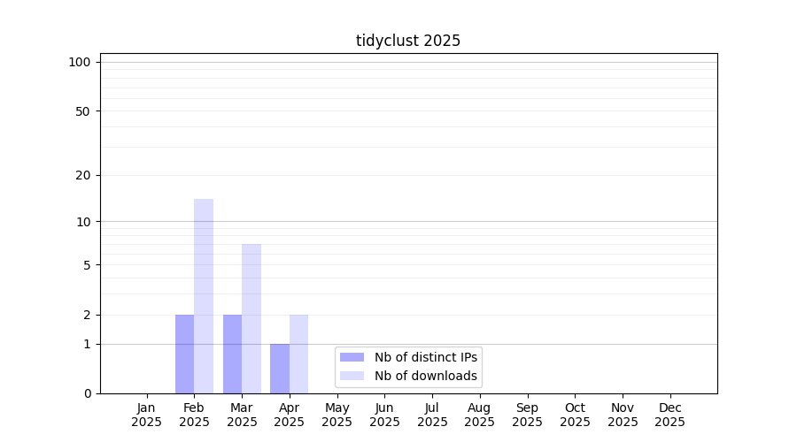 tidyclust_2025_stats.tab| Month | Nb of distinct IPs | Nb of downloads |